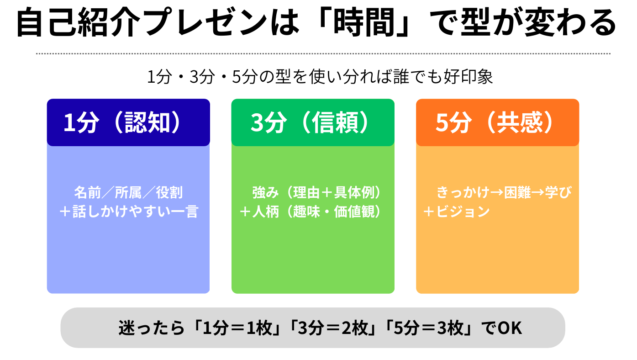 最初に結論です。自己紹介プレゼンは「時間」で型が変わります。