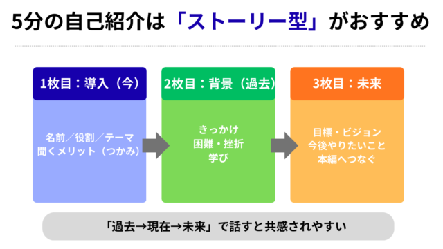 ポイント:5分の自己紹介は「情報を足す」よりも、「1本のストーリーで共感を作る」ことが重要です。