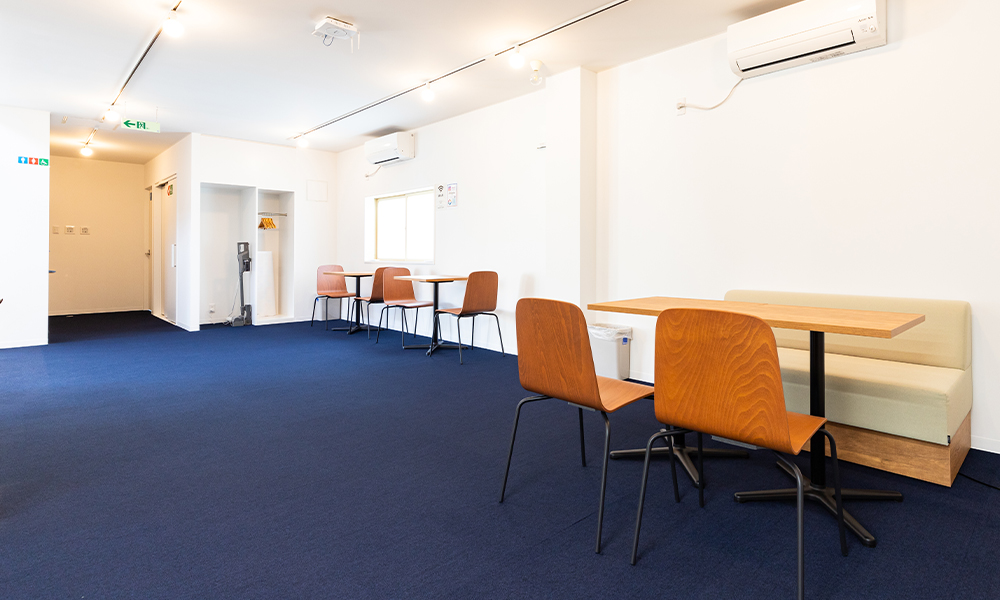 1階は「共有スペース」になっています。予約なしで誰でも無料で利用可能です。2階は貸し会議室および貸事務所となっています。貸し会議室(200円/時間)をご利用の際は、担当スタッフまでお気軽にお声がけください。