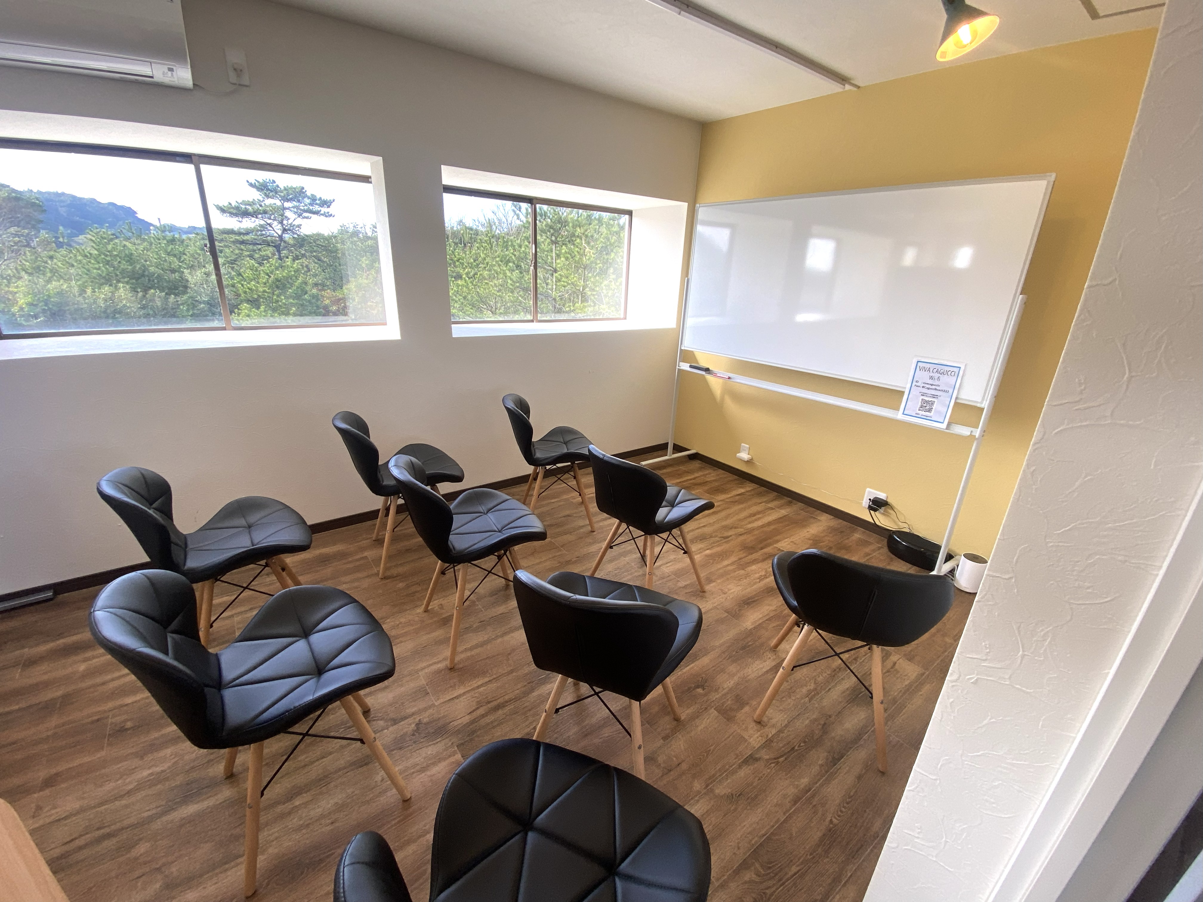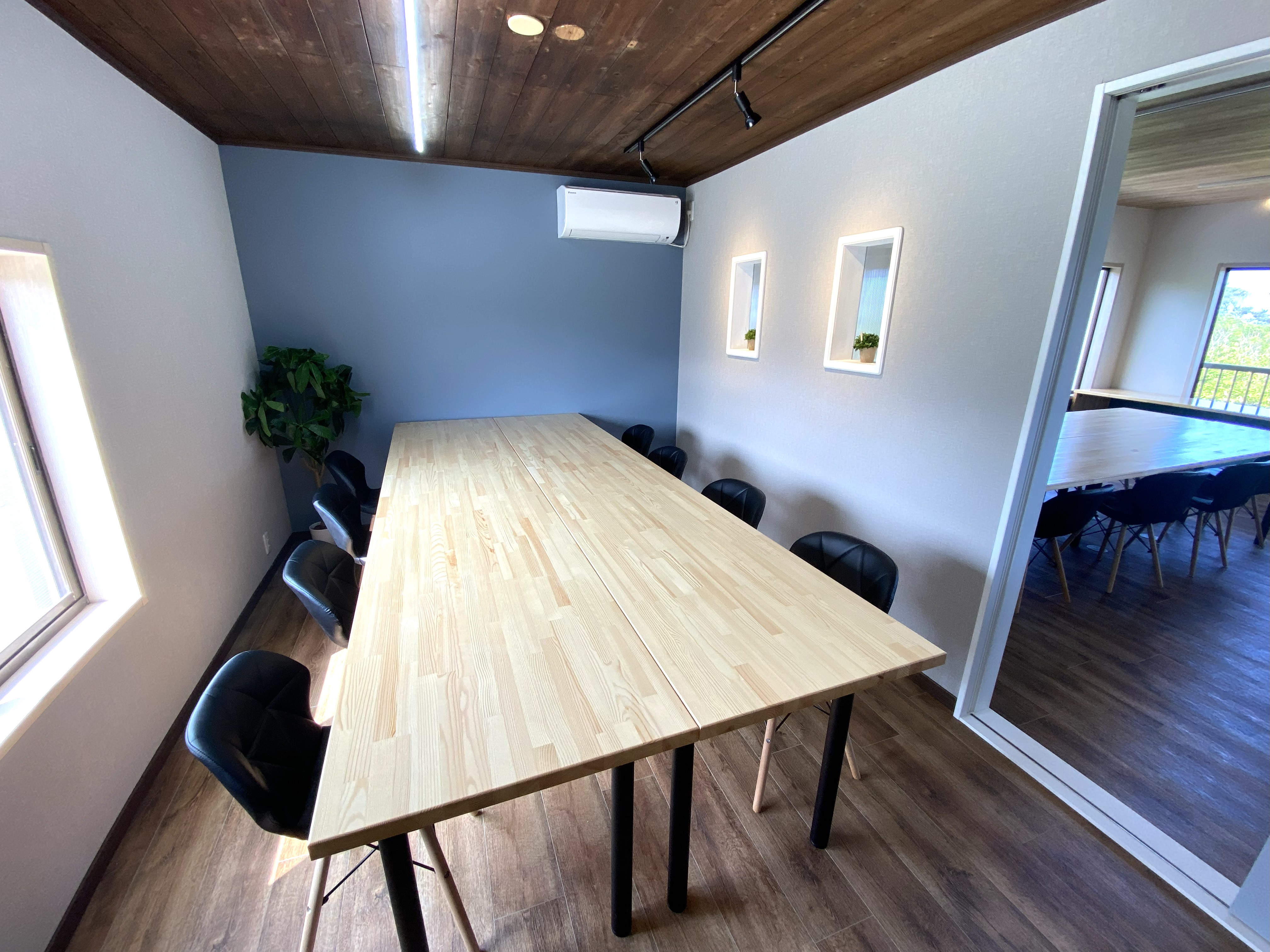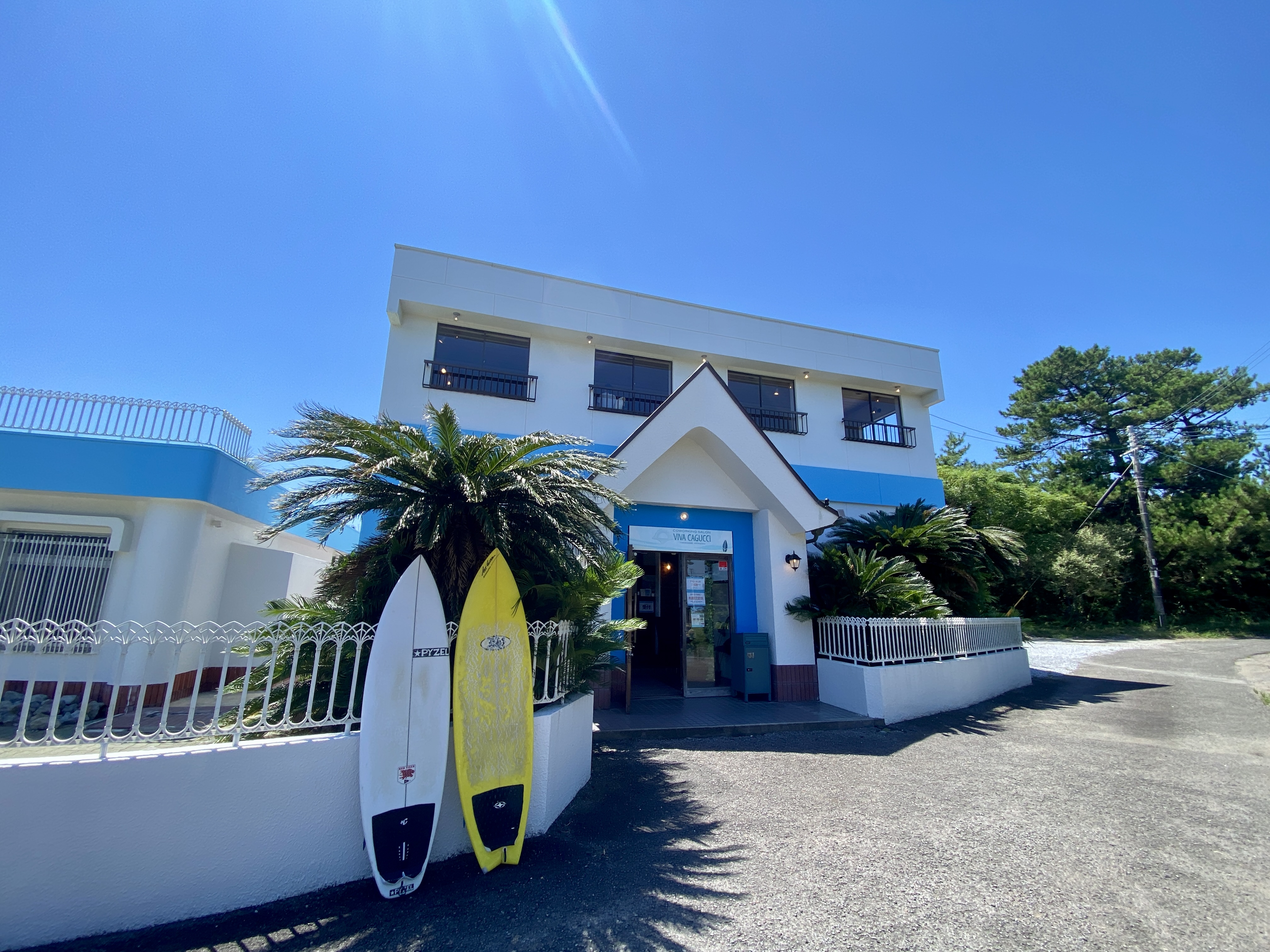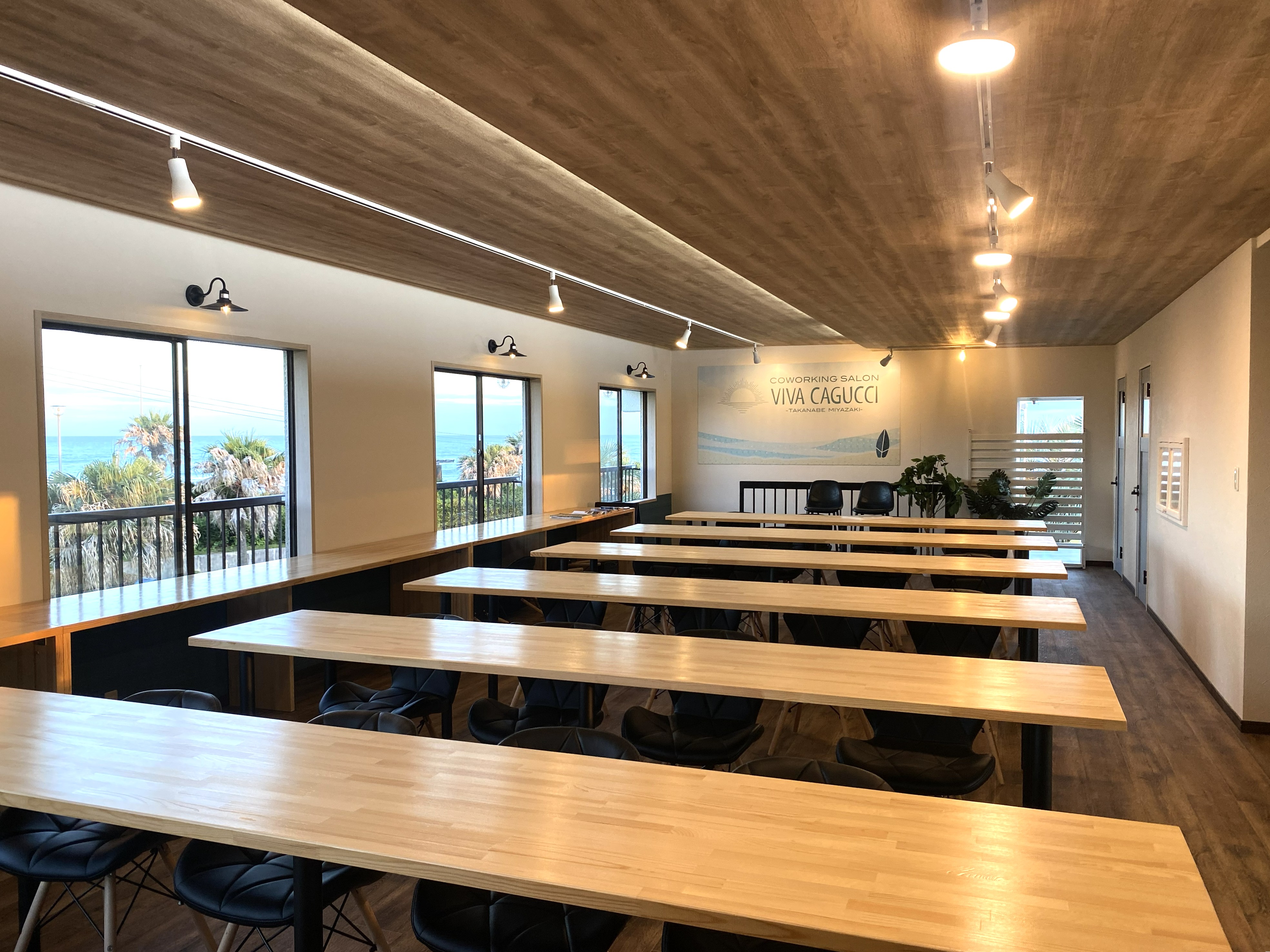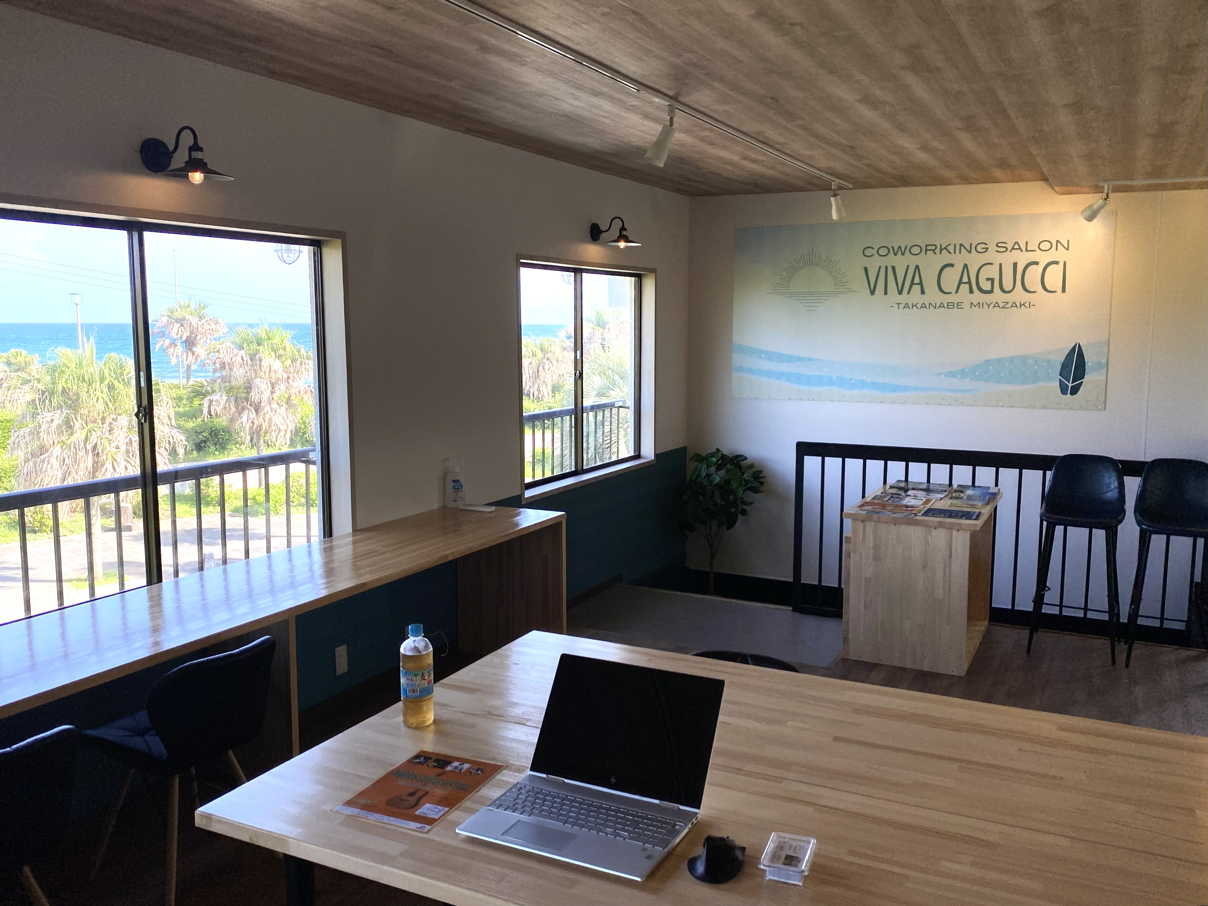 2階のコワーキングエリアからは海の様子が肉眼で確認でき、絶好の波が来ているときに、すぐに海に出ることができるなど、サーフィン好きには絶好の環境。